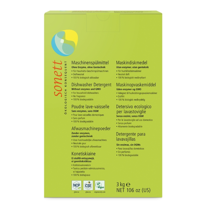 Mýdlo ztrácí okamžitě po použití, v bezprostřední reakci s vápníkem obsaženým vždy v odpadní vodě, své vlastností snižující povrchové napětí (primární odbourávání). Vápenaté mýdlo je následně ze 100 % rozkládáno na oxid uhličitý a vodu (sekundární odbourávání). Cukrové smáčedlo a deriváty kokosového oleje jsou získávány chemickou konverzí pomocí kyselin ze surových materiálů čistě rostlinného původu a kompletně si zachovávají svou přirozenou strukturu. Pro mikroorganismy je proto snadné je kompletně rozložit. Etanol je do přírodního cyklu navrácen během několika hodin. Upozornění: Pro dokonalý účinek je nutné pravidelně používat leštidlo a regenerační sůl do myčky SONETT. Celý obal je recyklovatelný